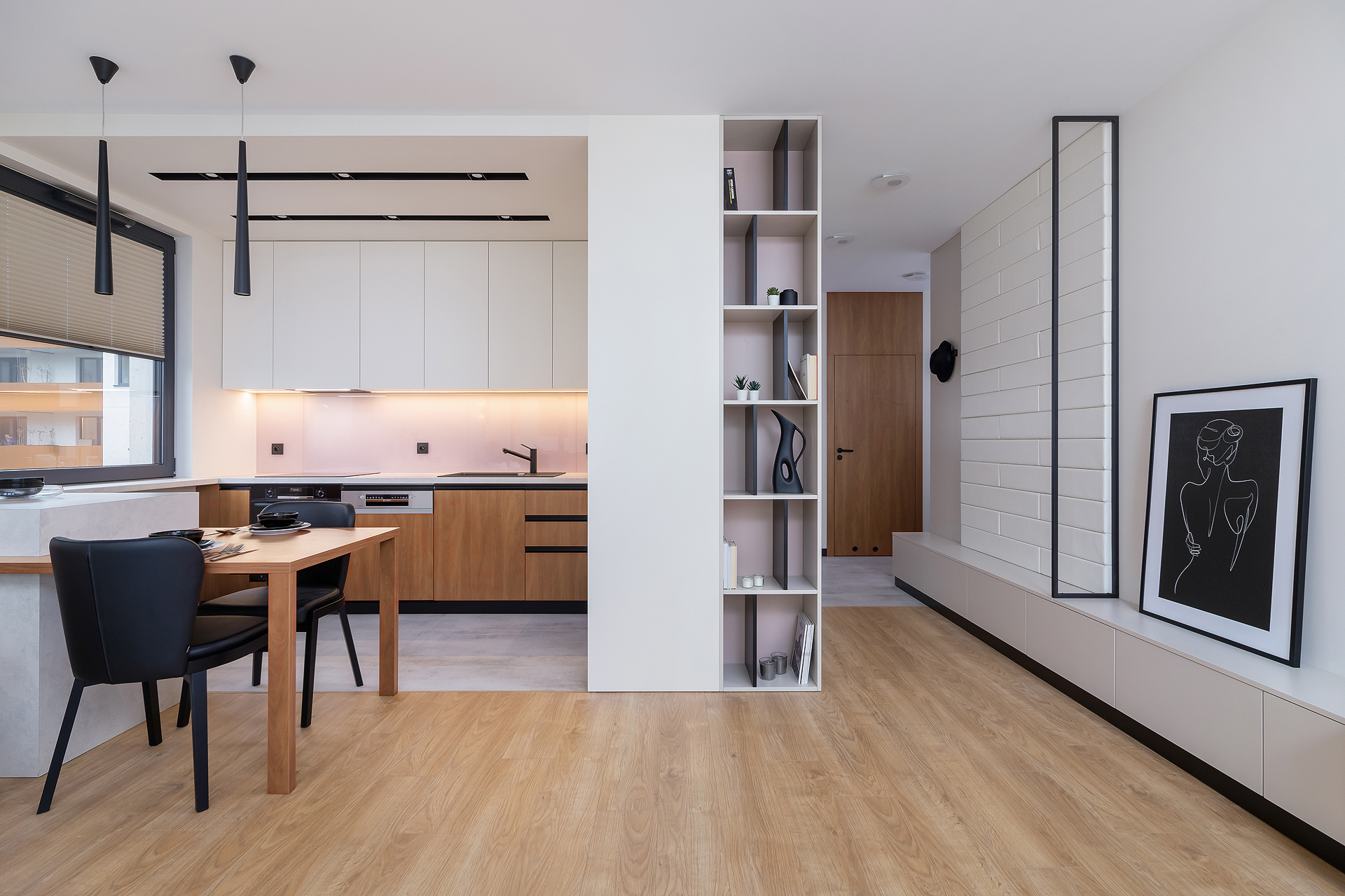 Mieszkanie składa się z przestronnego hollu z ukrytymi szafami, sypialni, łazienki oraz wygodnej kuchni z pokojem dziennym.